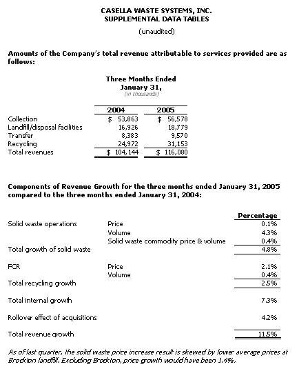 The company will host a conference call to discuss these results on Thursday, March 9, 2006 at 10:00 a.m. ET. Individuals interested in participating in the call should dial 719-457-2680 at least 10 minutes before start time. The call will also be webcast; to listen, participants should visit Casella Waste Systems' website at http://www.casella.com and follow the appropriate link to the webcast. A replay of the call will be available by calling 719-457-0820 (conference code #1321654) before 11:59 p.m. ET, Thursday, March 16, 2006, or by visiting the company's website.