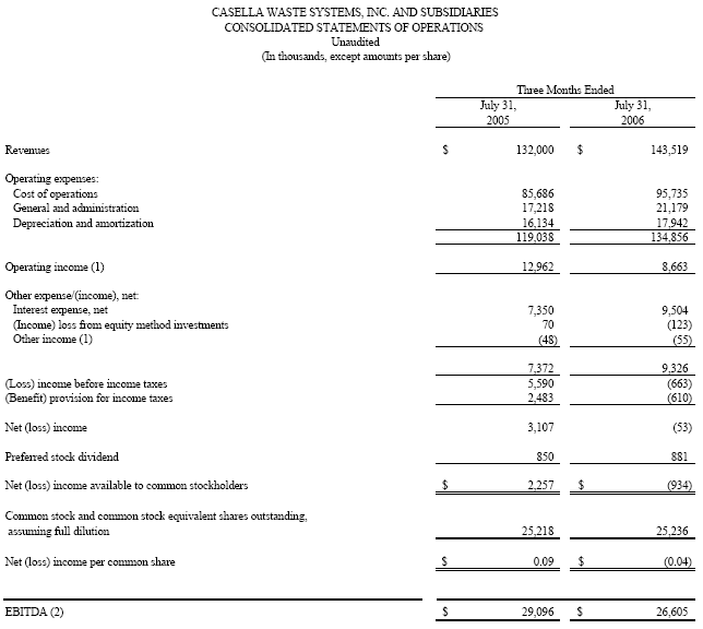 The company will host a conference call to discuss these results on Thursday, September 7, 2006 at 10:00 a.m. ET. Individuals interested in participating in the call should dial (719) 457-2645 at least 10 minutes before start time. The call will also be webcast; to listen, participants should visit Casella Waste Systems' website at http://www.casella.com and follow the appropriate link to the webcast. A replay of the call will be available by calling (719) 457-0820 (conference code #6374936) before 11:59 p.m. ET, Thursday, September 14, 2006, or by visiting the company's website.